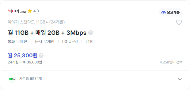 이야기모바일의 스탠다드 11GB+ 요금제는 매월 25,300원으로 월11GB의 데이터, 매일 2GB의 데이터 사용이 가능하고 다 사용한 이후에는 3Mbps의 속도로 인터넷을 계속 사용할 수 있는 요금제입니다. 2만원대의 가격으로 통화, 문자, 데이터를 무제한으로 사용할 수 있어 좋습니다. 다만 유심을 4,400원에 별도 구매해야 하고 평생 요금제가 아닌 24개월 장기 요금제입니다.