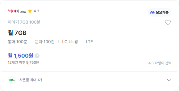 이야기모바일의 이야기 7G 요금제도 상당히 좋은 가성비로 출시가 되었습니다. 월 1,500원으로 통화 100분, 문자 100건, 무려 7G의 데이터 사용량을 지원합니다. 다만 일반 유심의 경우 4,400원의 비용이 필요하고 12개월 사용후에는 매월 9,750원이 청구됩니다. 12개월 동안 1,500원으로 사용가능한 점이 장점인 것 같습니다. 참고로 통신망은 LG 유플러스입니다.