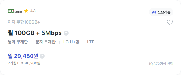 [이지모바일] 이지 무한100GB+ | 29,480원 | 모요, 모두의요금제