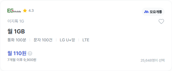 [이지모바일] 이지톡 1G | 110원 | 모요, 모두의요금제