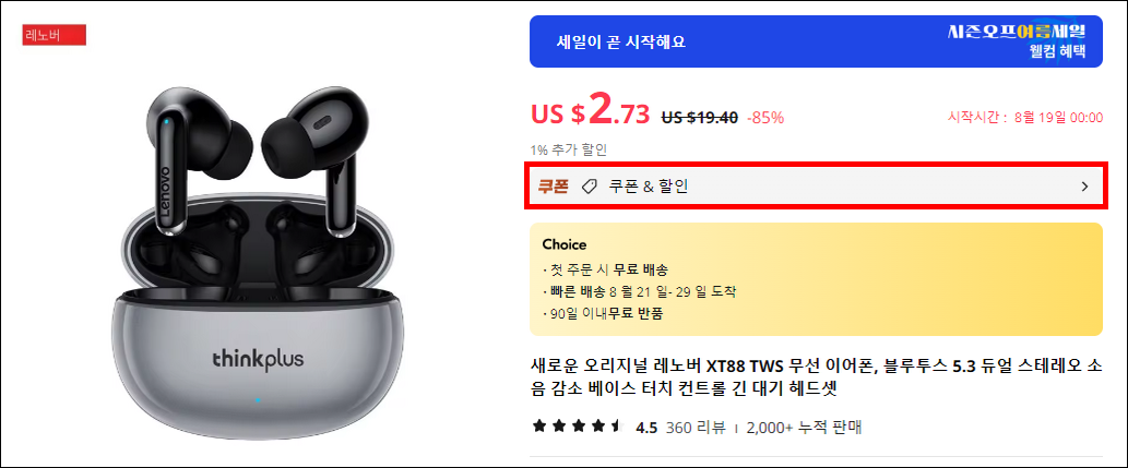 ➡️ 8월 19일 한정 선착순 할인코드