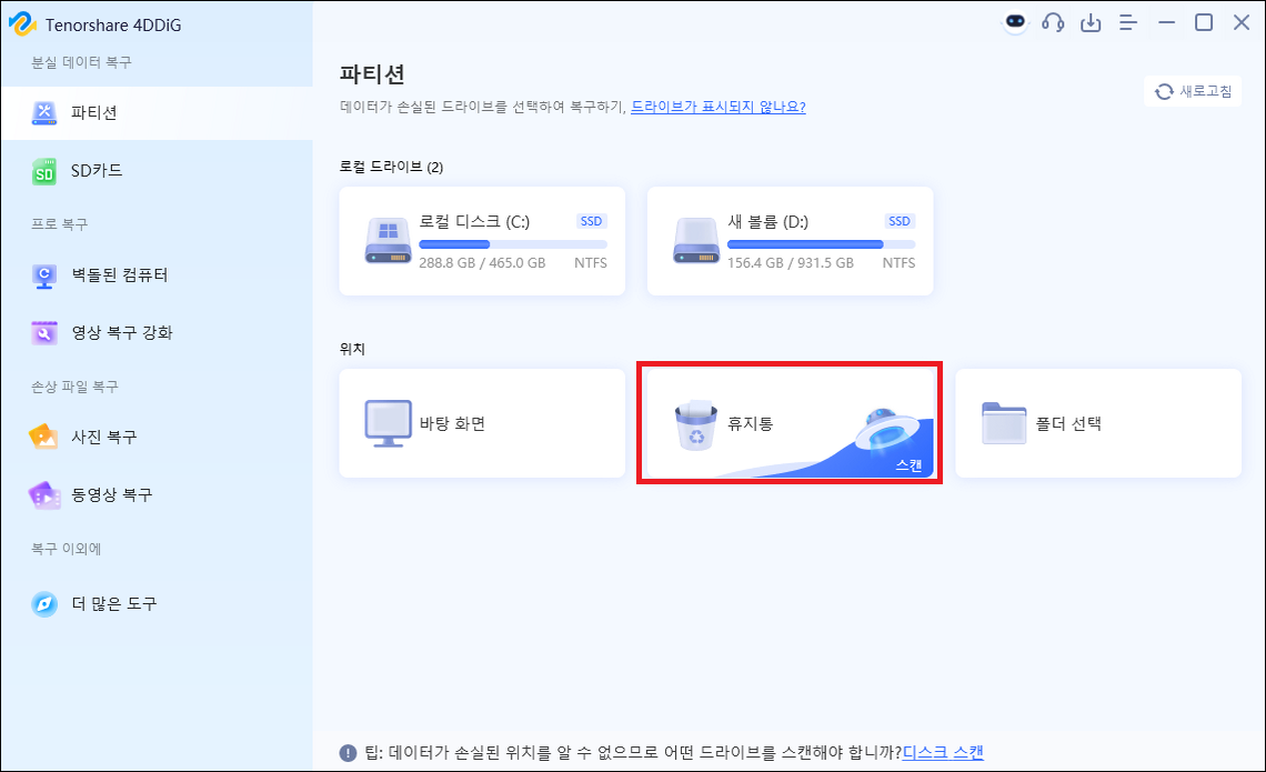 그런데 4DDiG 데이터 복구 프로그램은 이런 경우도 클릭 몇 번으로 바로 복구가 되어서 살짝 놀랬습니다. 먼저 프로그램을 설치한 후 실행하면 위와 같은 윈도우 창이 뜨게 됩니다. 가볍게 바로 휴지통 스캔을 시도해 보겠습니다.