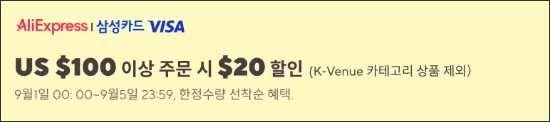 9월에 사용할수 있는 알리 익스프레스 할인카드는 삼성 비자카드로 결정이 되었습니다. 비자 삼성카드로 알리 결제 시 100달러 이상 구매하면 20달러 할인이 가능합니다. 해당 카드가 있다면 꼭 추가 할인 혜택을 받으시면 좋을 것 같습니다.