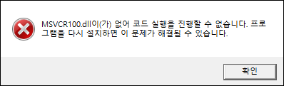 PC에서 어떤 프로그램을 실행하려고 하는데 오류창이 뜨면서 프로그램이 실행되지 않는 경우를 종종 겪게 됩니다. 저도 분명 얼마 전까지는 잘 사용했던 프로그램인데 아래와 같이 "MSVCR100.dll이 없어 코드 실행을 진행할 수 없습니다."라는 오류로 살짝 고생한 적이 있습니다.