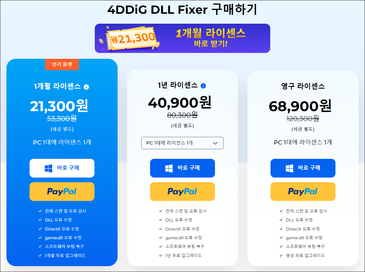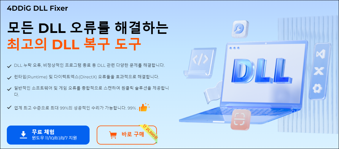 제가 이번에 소개해드릴 4DDiG DLL Fixer 프로그램은 여러 가지 DLL 관련 오류나 런타임 오류, Direct X 오류 등을 클릭 몇 번으로 간단하게 해결 가능한 소프트웨어입니다. 특히 윈도우와 관련된 오류 또는 게임 실행과 연관된 여러 가지 오류를 쉽고 간편하게 해결이 가능하기 때문에 각종 오류 메시지로 인해 고생하셨던 분들에게 꼭 필요한 프로그램이라고 생각합니다.