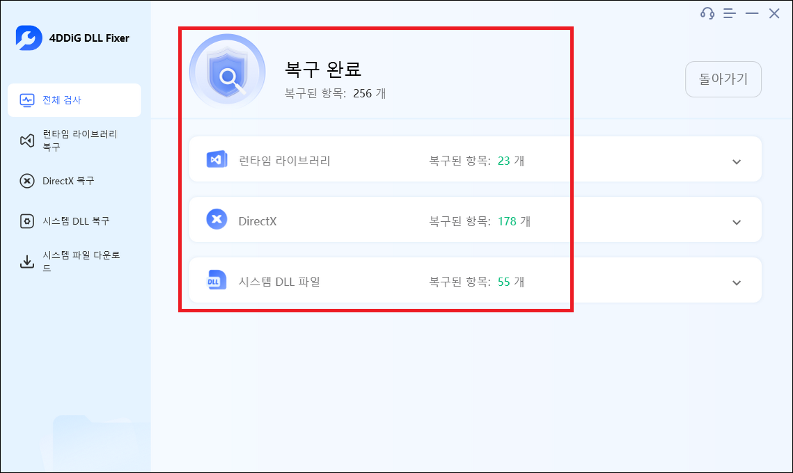 내 컴퓨터에서 발견된 각종 오류를 복구하는 방법도 사실 매우 간단합니다. 그냥 4DDiG DLL Fixer의 <복구>를 클릭하기만 하면 저절로 복구가 시작됩니다. 저같은 경우는 DirectX쪽으로 복구할 항목들이 많다 보니 제법 시간이 걸렸지만 무사히 256개 항목이 잘 복구되었습니다.