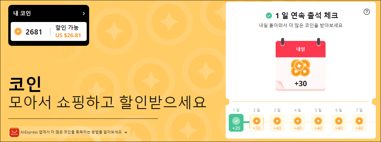 알리 익스프레스 제품들의 경우 미리 받아놓은 코인으로 1% 이상 추가 할인을 받는 것이 가능합니다. 알리 어플이나 홈페이지에서 <내 계정 - 내 코인> 메뉴를 누르시면 위와 같이 간단하게 코인 적립이 가능합니다. 이렇게 받은 코인들로 결제 시 할인이 가능하니 꼭 챙겨두시기 바랍니다.